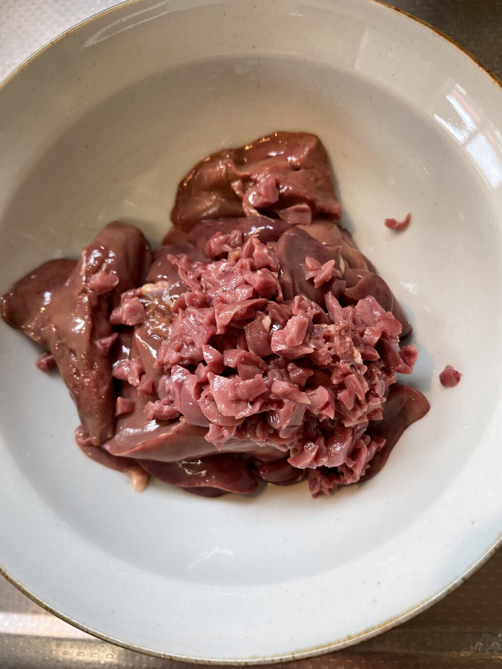 1,鶏レバーはハツを外して2当分にして細かく刻む。レバーはそれぞれを二等分にしてボールに移す。血抜きや筋を外さなくても大丈夫。