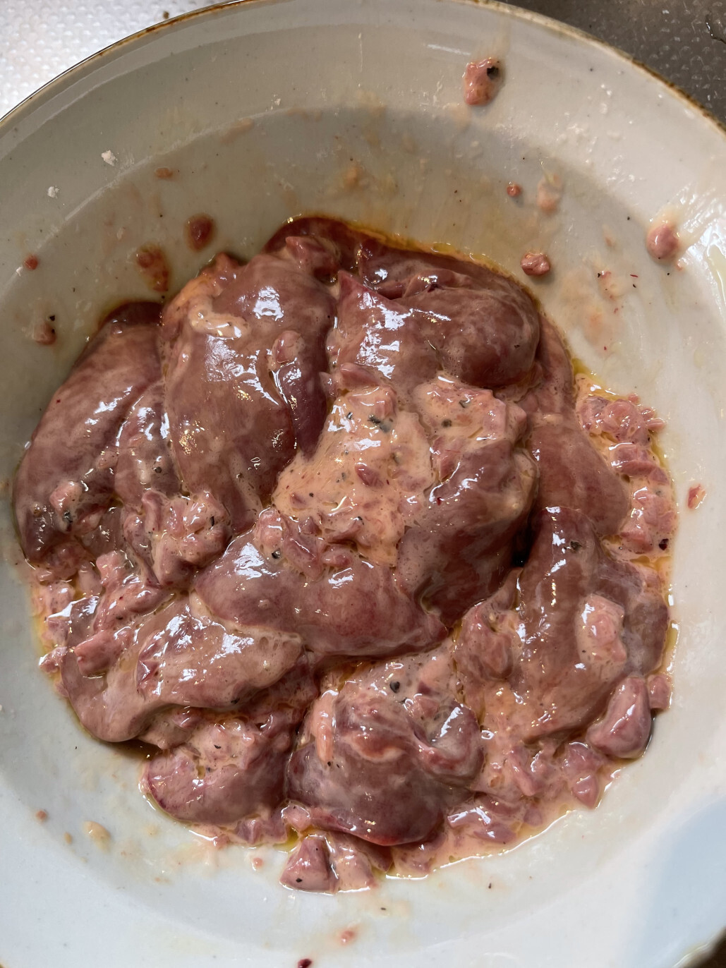 2,ボールに鶏レバーとハツを入れたら塩胡椒をして揉み込み、白ワインを入れてから片栗粉を入れる。ちょっと粘度がある感じになるまで片栗粉を入れたらオリーブオイルを入れて混ぜる。塩分はこれだけなのでちょっと強めでも