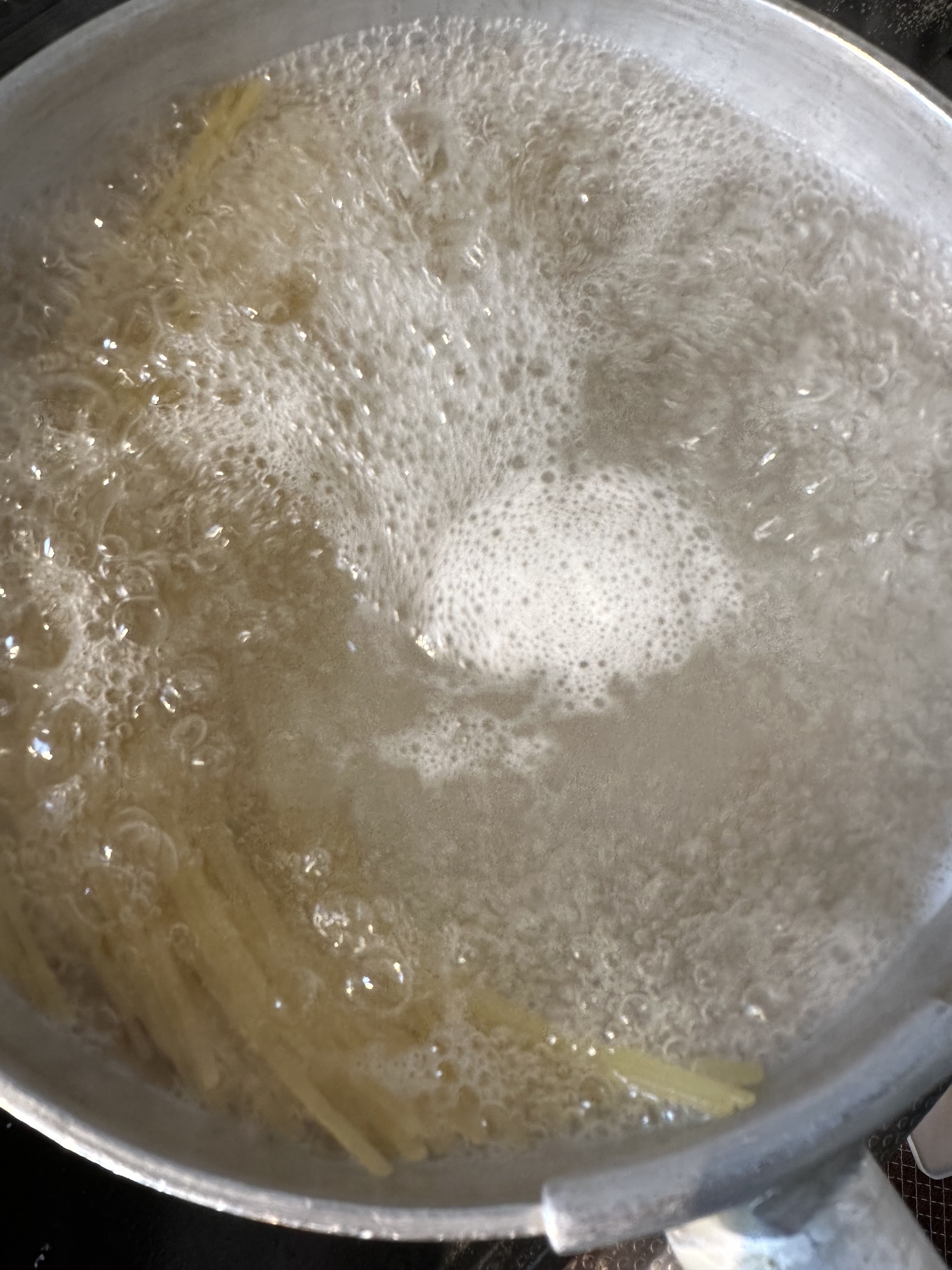 1,お湯を茹でて沸騰したら塩を入れてスープと同じような塩加減にしパスタを茹で始める。