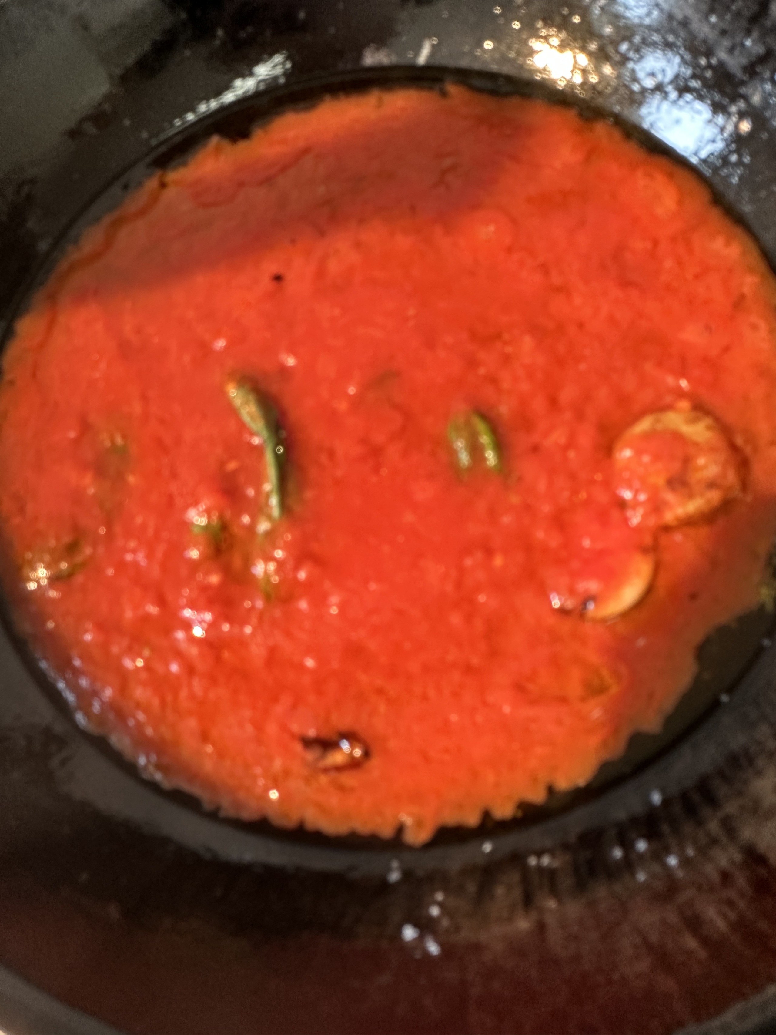 裏漉しトマト、にんにく、バジルの葉、唐辛子、パスタ、塩
