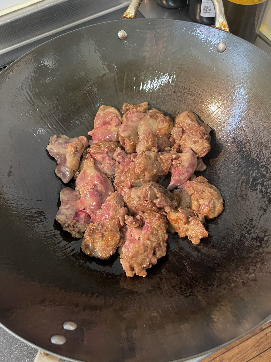 2,中華鍋に油を入れ、煙が出てきたら、レバーと潰したニンニクを入れ両面焼くように炒める。両面に色がついたら取り出しておく。その後器にもる。