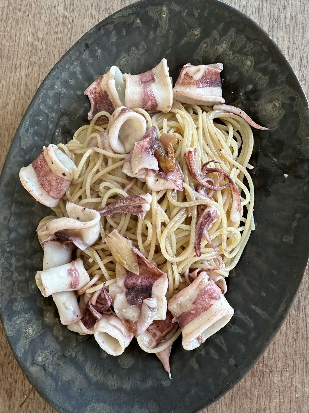 ヤリイカ、パスタ、ニンニク、白ワイン、唐辛子、オリーブオイル、塩辛、塩胡椒。